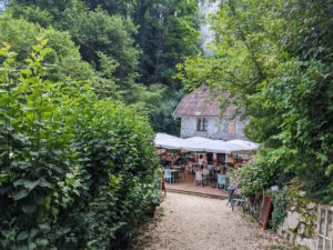 Further up, we walked through quite a bit of woods (Rue du Moulin) and arrived at the water mill – quite a bit out of breath. But at that point that didn’t matter, it was a brilliant view and within minutes we completely forgot how out of breath (and – at this point – starving) we were. The door was open so naturally we had to have a peak inside.